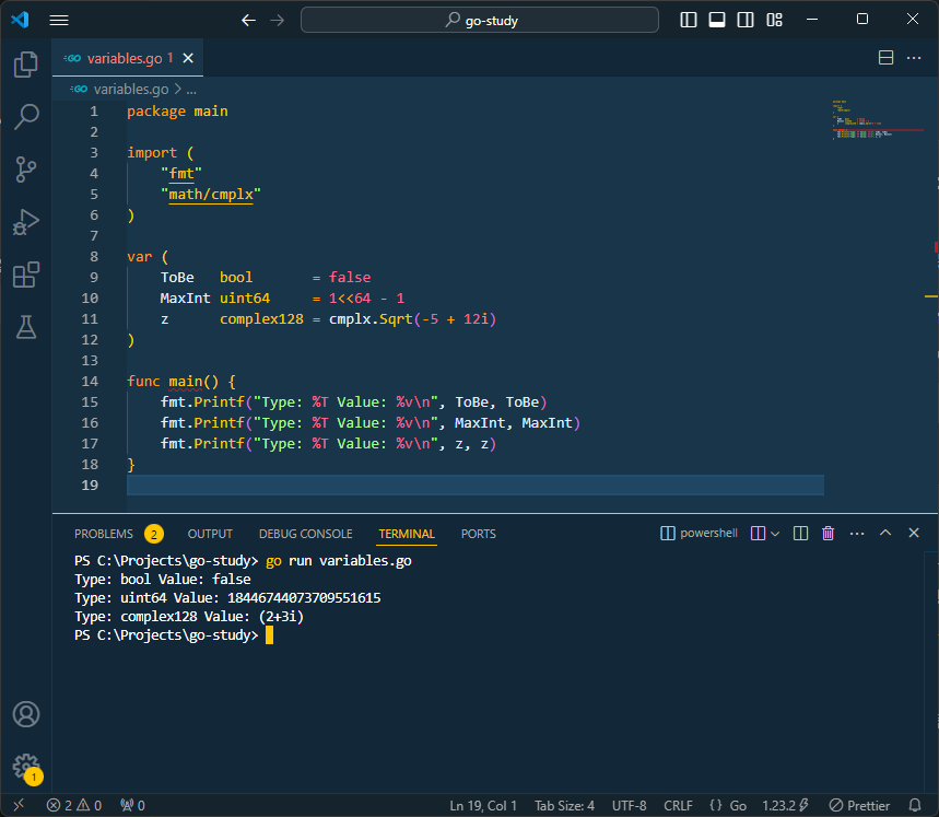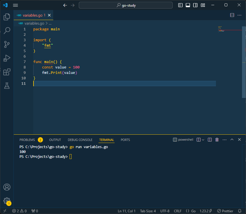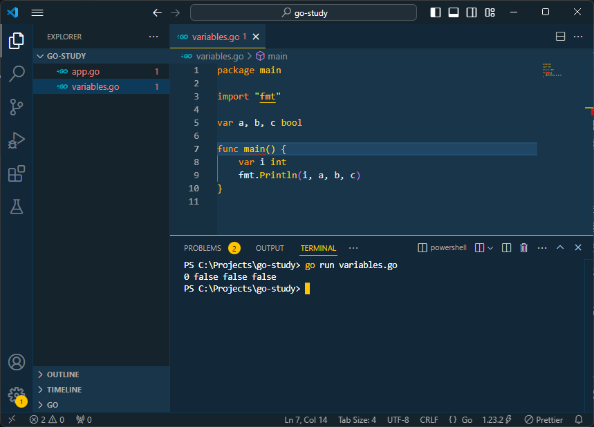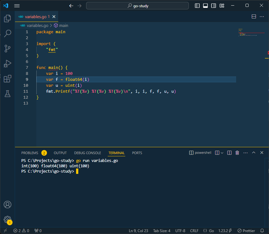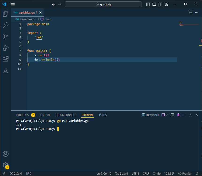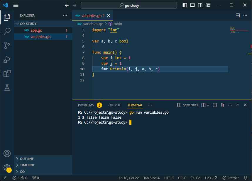 variables.go라는 파일을 생성하여 다음과 같이 작성해보고 실행해봅시다.